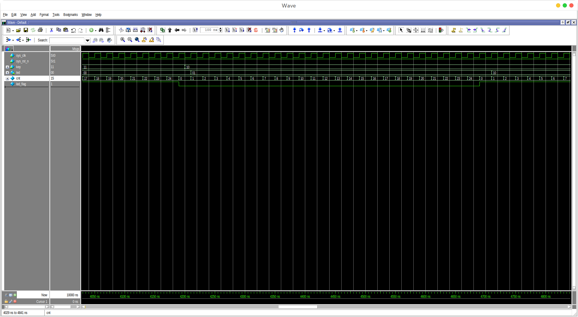 由仿真图可看出,当KEY=01时,两个LED灯同闪同灭,时间间隔为0.5s(仿真为了提高效率采用500ns)。综上所述,RTL代码无误。